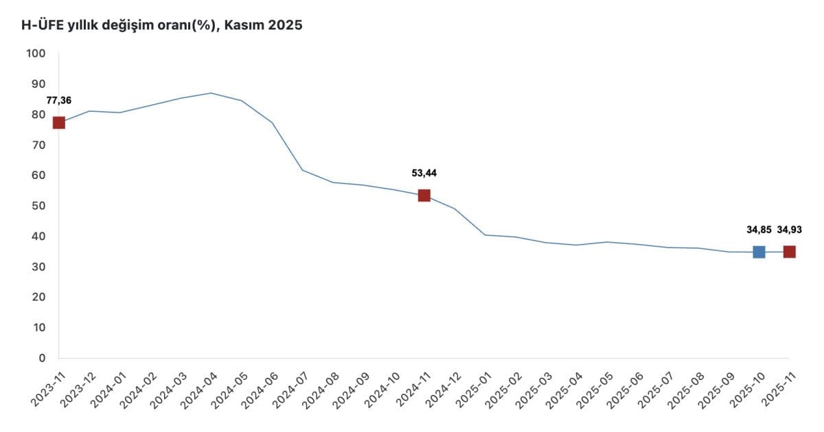 Buna göre H-ÜFE, geçen ay bir önceki aya kıyasla yüzde 0,7 düşüş gösterirken geçen yılın aralık ayına göre yüzde 34,07, geçen yılın aynı ayına kıyasla yüzde 34,93 ve 12 aylık ortalamalara göre yüzde 37,71 yükseldi.