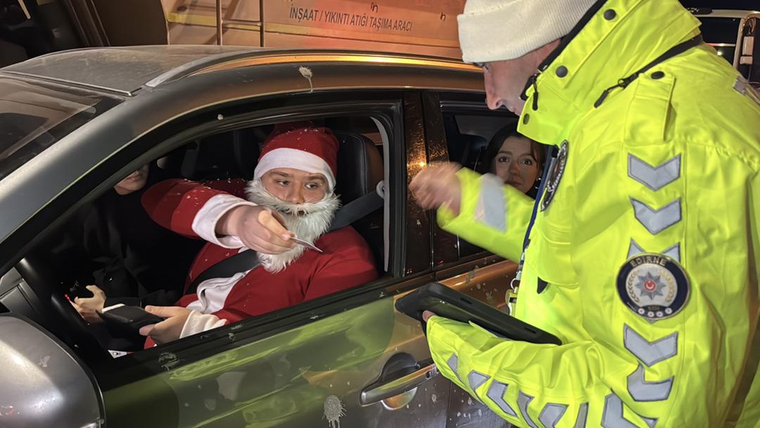 Edirne‘de “Noel Baba” kostümüyle yılbaşı eğlencesine giden sürücü, trafik denetiminde durdurulunca ortaya renkli görüntüler çıktı.