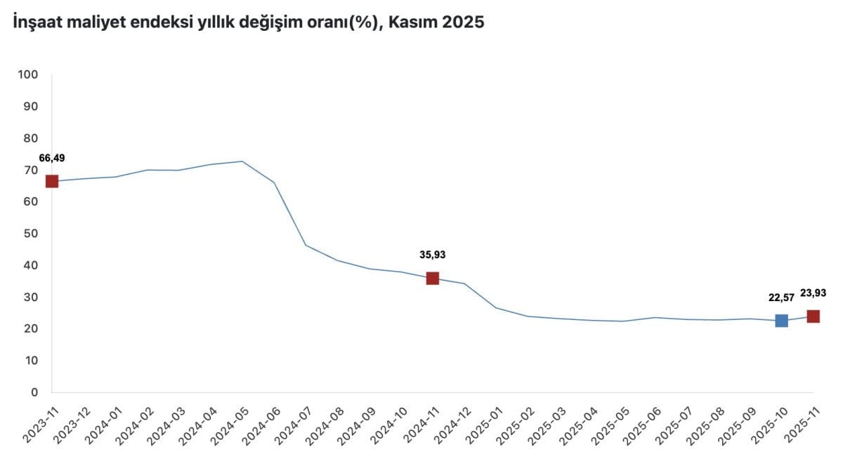 Türkiye İstatistik Kurumu (TÜİK) verilerine göre inşaat maliyet endeksi, yıllık yüzde 23,93 ve aylık yüzde 1,14 arttı