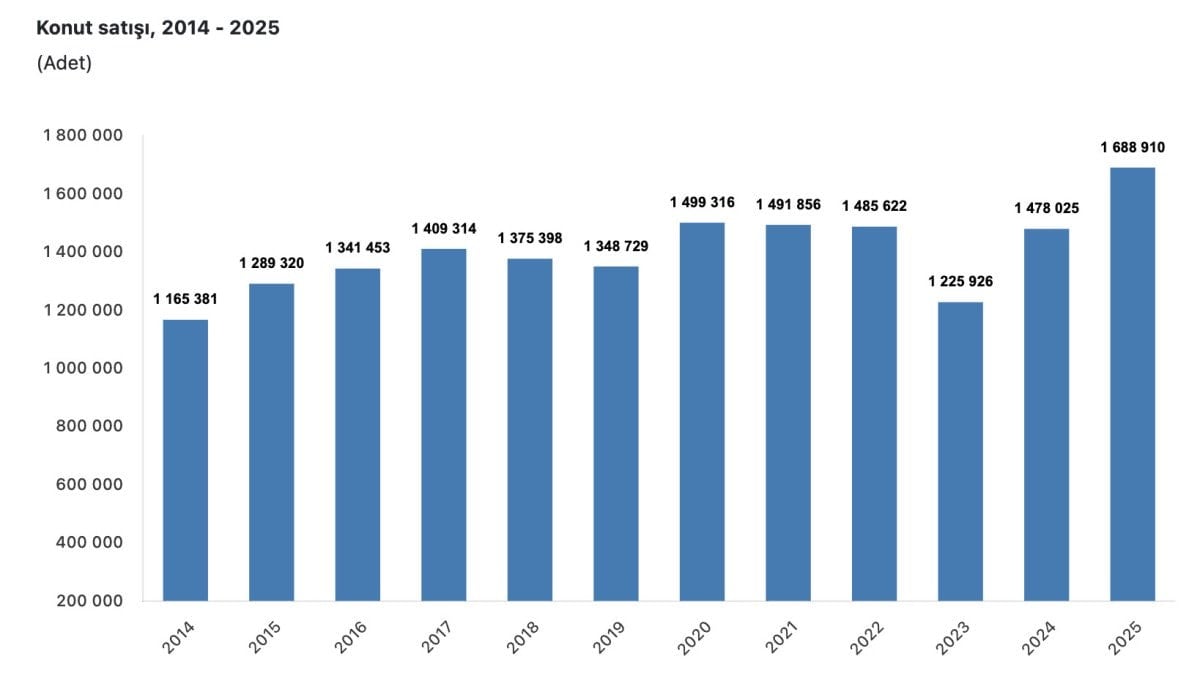 Türkiye İstatistik Kurumu (TÜİK) verilerine göre, Türkiye genelinde konut satışları 2025 yılında, bir önceki yıla göre yüzde 14,3 oranında artarak 1 milyon 688 bin 910 oldu.