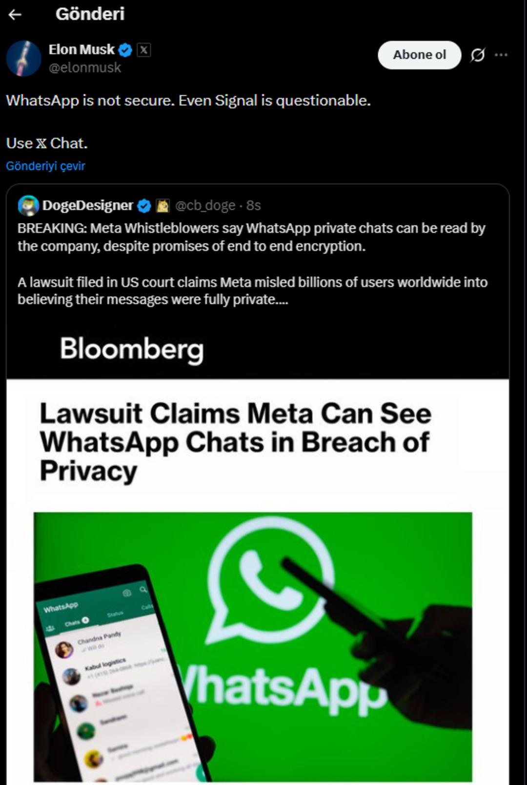 Musk ayrıca, WhatsApp’ın sahibi Meta’nın gizliliği ihlal ederek sohbetleri görebildiğini iddia eden bir davanın konu edildiği yakın tarihli bir Bloomberg haberini paylaştı.