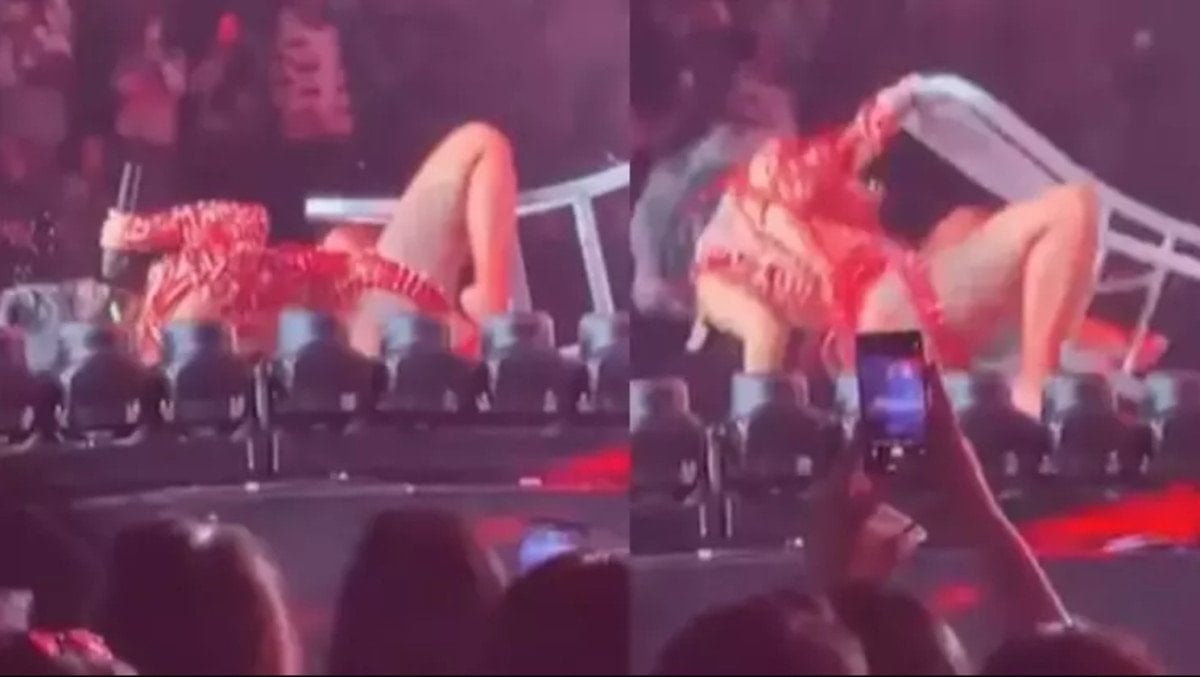 Görüntülerde, sanatçının ritimle dans ettiği ve bir anda dengesini kaybederek sandalyeden aşağı doğru yuvarlandığı görüldü.