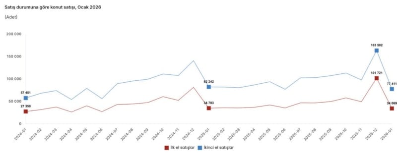 Türkiye genelinde konut satışları 2026 yılı Ocak ayında, bir önceki yılın aynı ayına göre yüzde 2,1 oranında düşerek 34 bin 69 oldu.