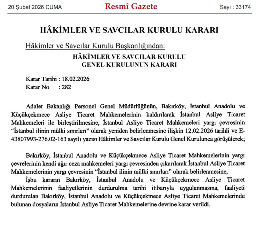 Resmi Gazete‘de yayımlanan kararda, “Bakırköy, İstanbul Anadolu ve Küçükçekmece Asliye Ticaret Mahkemeleri yargı çevrelerinin kendi ağır ceza mahkemeleri yargı çevresinden çıkartılarak İstanbul Asliye Ticaret Mahkemelerinin yargı çevresinin ‘İstanbul ilinin mülki sınırları’ olarak belirlenmiştir” ifadesine yer verildi.
