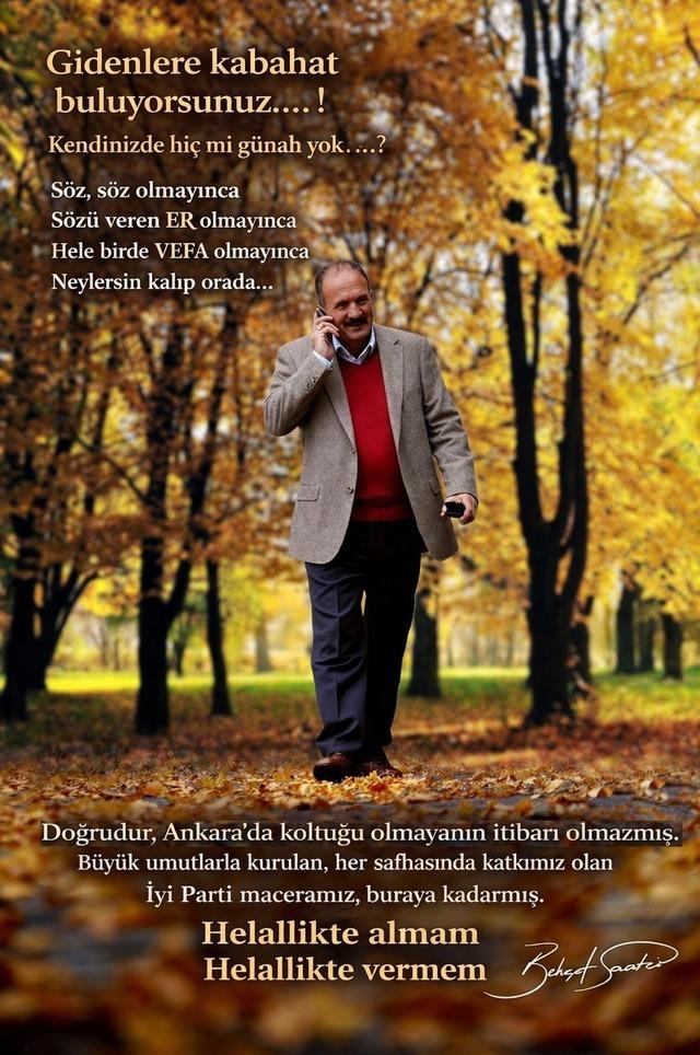 Saatcı, sosyal medya paylaşımında, ‘’Gidenlere kabahat buluyorsunuz, Kendinizde hiç mi günah yok, Sözü veren er olmayınca, hele bir de vefa olmayınca, neylersin kalıp orada. Doğrudur, Ankara’da koltuğu olmayanın itibarı olmazmış. Büyük umutlarla kurulan her safhasında katkımız olan İYİ Parti maceramız buraya kadarmış. Helallik de almam, helallik de vermem’’ ifadelerini kullandı.