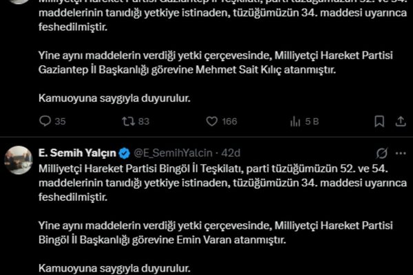 MHP Genel Başkan Yardımcısı Yalçın, Bingöl ve Gaziantep il teşkilatlarının feshedildiğini açıkladı. Yalçın, sosyal medya…